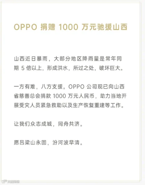 16.oppo捐赠1000万元驰援山西