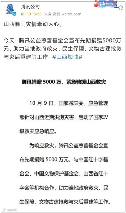 1.腾讯向山西捐赠5000万元