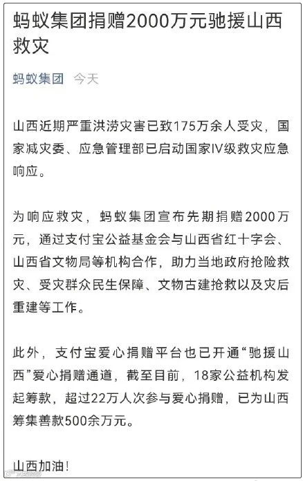 7.蚂蚁集团捐赠2000万元驰援山西