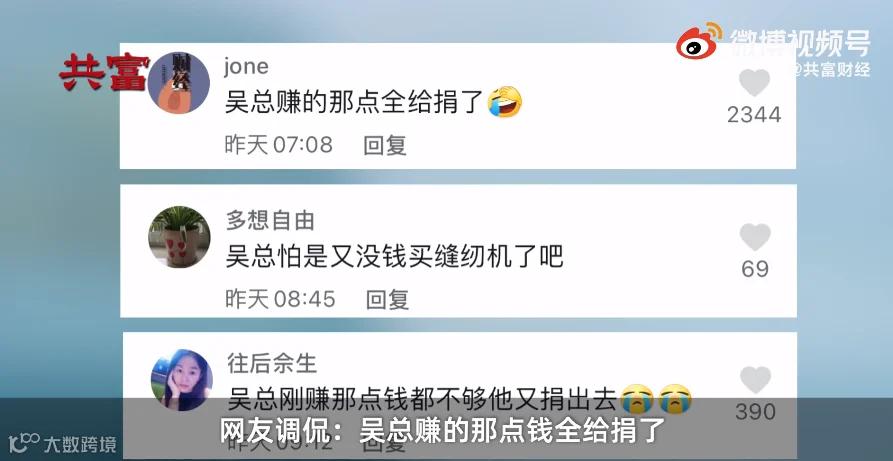 网友调侃,吴总别把买缝纫机的钱也捐了。