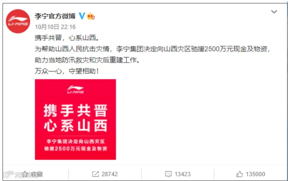 14.李宁捐赠2500万元驰援山西