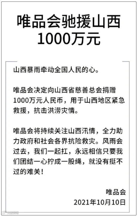 10.唯品会捐赠1000万元驰援山西