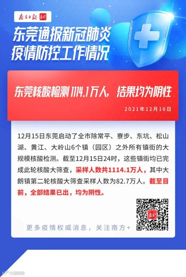 东莞已对28个镇街(园区)展开了大规模核酸筛查,包括大朗镇的第二轮大规模核酸筛查在内,截至16日下午,全部检测结果均为阴性。
