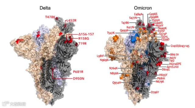 奥密克戎相较于德尔塔变体的突变点。