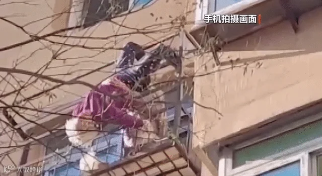 当时,老人从5楼窗口坠落倒挂在4楼阳台