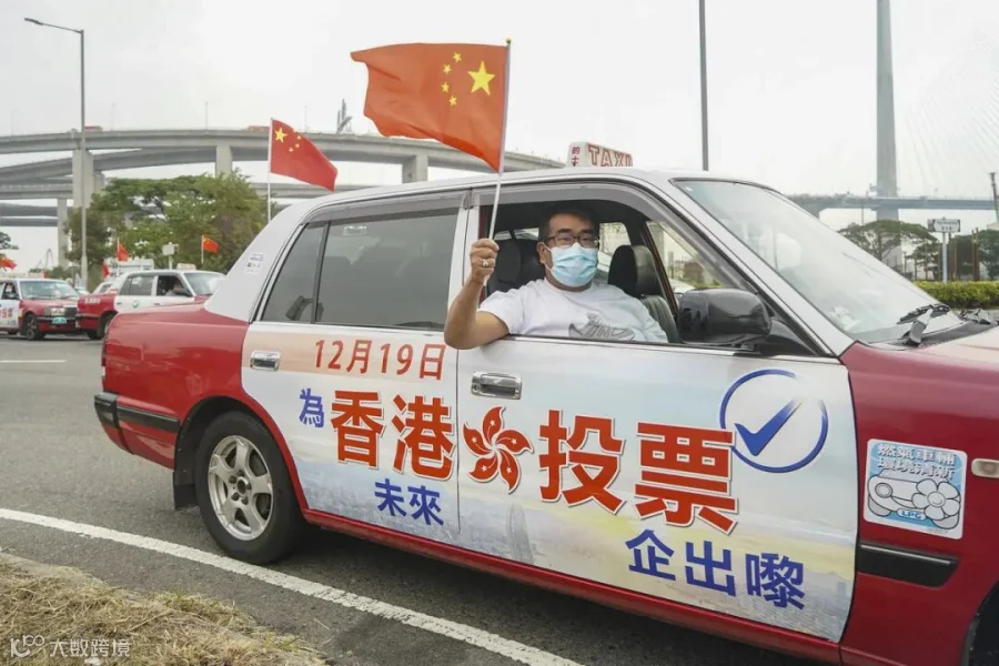 12月19日是完善选举制度后香港首次举行立法会选举。香港的士司机从业员总会(“的总”)18日在青衣货柜码头举行士巡游。500多部的士挂上国旗,贴上“投票 企出嚟”“香港投票”“履行公民责任”等宣传标语进行巡游,与香港市民一同营造选举氛围。