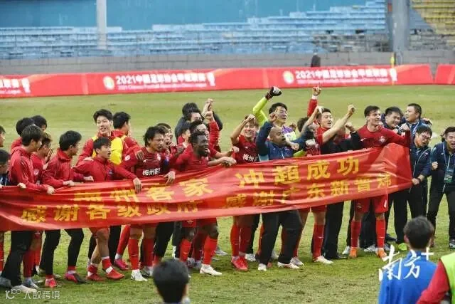 今天,梅州客家冲超成功,兑现了“努力实现3年内冲超的目标。”梅州客家成为中超历史上首支主场设在县级城市的球队,也成为足球之乡梅州历史上的首支中超球队。