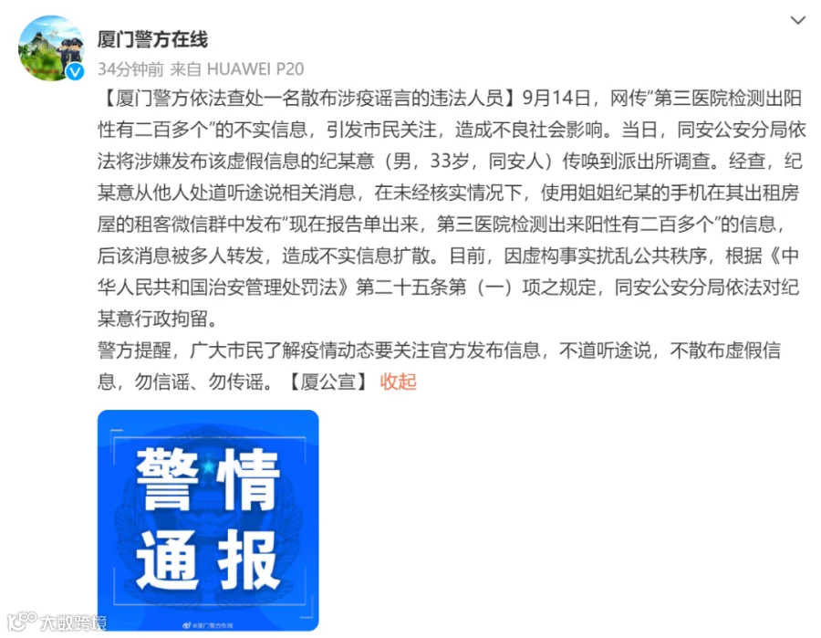 另据厦门市公安局官方微博@厦门警方在线 通报,厦门警方依法查处一名散布涉疫谣言的违法人员,该人员已被行政拘留。