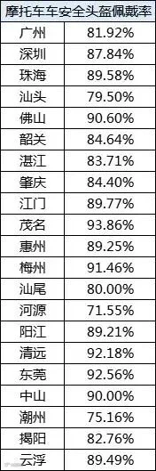 其中,佛山、茂名、梅州、清远、东莞摩托车驾乘人员头盔佩戴率相对较高,均超过90%;汕头、河源、潮州相对较低,不足80%。