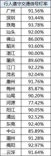 其中,深圳、珠海、韶关、江门、茂名、清远、东莞、揭阳遵守率超过92%,佛山、肇庆、梅州、河源、中山遵守率不足90%。梅州文化路、河源中山大道、永康大道、河紫路相关路口行人遵守信号灯率不足75%。