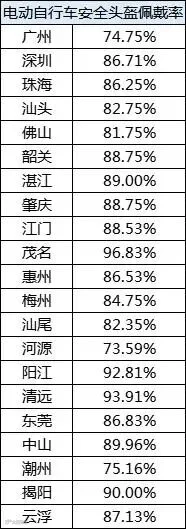 其中,茂名、阳江、清远电动自行车驾乘人员戴头盔率相对较高,均超过90%;广州、河源相对较低,均不足75%。
