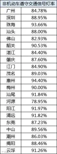 其中,珠海、韶关、惠州、汕尾、阳江、清远、云浮遵守率超过90%,广州、佛山、湛江、江门、河源遵守率不足85%,广州环市路、佛山南海大道、湛江海滨大道北、江门鹤山大道、华侨城路、河源中山大道、建设大道、东莞莞太路、潮州金碧路非机动车遵守信号灯率不足80%。