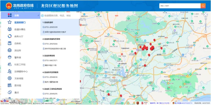 据悉,龙岗区通过直观、可视、清晰的政务地图形式,将市民生活中经常遇到的上学、看病、养老、休闲等具体问题,进行了一一分解,为市民提供最关心的教育、医疗、养老等查询信息服务。同时,围绕疏解整治促提升、城市精细化管理、优化营商环境等重点工作,丰富地图内容,覆盖政府单位、户政事务、民政救助、社保医保、教育资源、医疗卫生、文体事业等重点民生领域,共涉及23类1084个服务点位数据,汇聚到政务服务地图中,为市民办事减少了不少麻烦,有效方便了市民的衣食住用行,打通了政务公开服务群众的“最后一公里”。