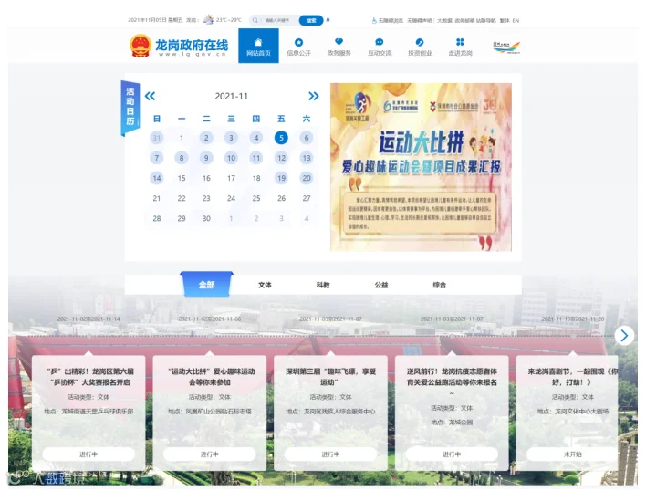 同时,为丰富市民日常生活,满足文娱需求,给市民生活带来更多便利,龙岗区推出城市活动日历功能,涵盖文娱、体育赛事、展会、公益活动等各类城市活动,力求每一天都有丰富的优质文旅活动呈现。城市活动日历按照文娱、体育、公益活动等类别对活动进行分类展示,以卡片的形式简洁大方地展示活动时间、开展单位、活动地点等相关信息,同时市民可按日期、类别、活动进程等方式筛选查阅浏览活动详细信息。