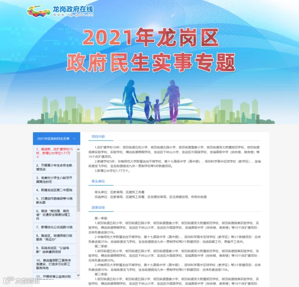 在龙岗区六届人大八次会议第三次全体会议上,区人大代表投票表决确定了2021年民生实事项目,共22项,涉及教育、交通、环保、文体设施、行政服务等民生领域。为方便广大人民群众了解各项民生实事进程,也为了广大人民群众能更好地监督政府工作,龙岗政府在线开设了“2021年民生实事”专题栏目,设立项目内容、牵头单位、进度安排、进展情况四个子项,实时公布各项目进展情况,真正做到想民之所想,急民之所急、民之所需,干民之所盼。