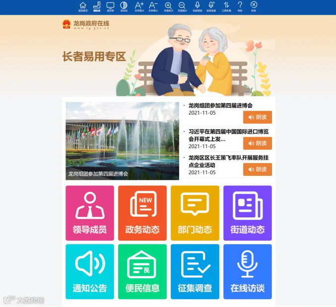 据悉,根据长者的办事需求,龙岗区推出适老服务专题,采用“大字体+大图标+语音服务”为设计特点,归纳老年人福利、养老服务,补助津贴、户籍服务、认证证明服务,便民查询等老年人高频服务事项便捷办理,让老年人办事少跑腿。同时还开设政务动态、部门动态、街道动态、通知公告、征集调查等政务信息栏目,便于老年人获取信息和服务。专题信息列表配备有阅读按钮,可采用语音形式播报出信息标题。进入信息内容页,网站便会自动开始朗读全文,为老年人消除“数字鸿沟”,让老年人在信息化浪潮中有更多确定感、幸福感、安全感。