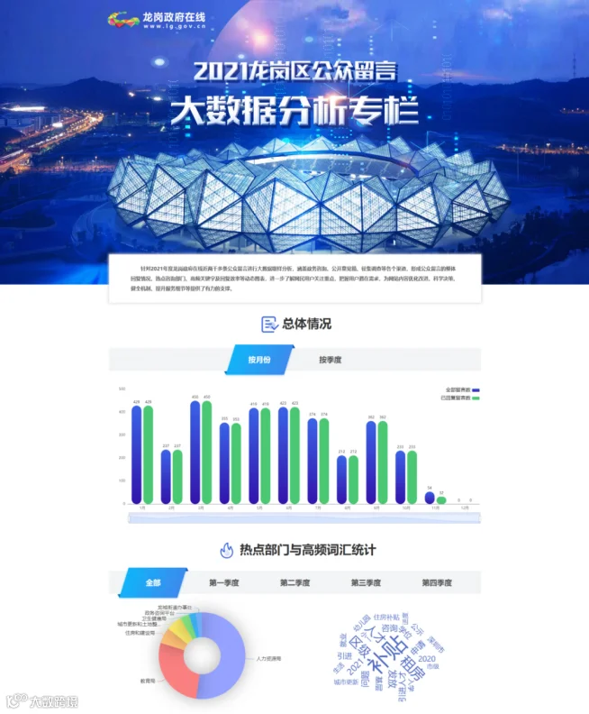 龙岗区以“懂民情,知民意,发民声”为理念,充分利用大数据技术,创新服务模式,构建“网民留言数据分析”平台。龙岗区利用大数据分析技术,对政府在线政务咨询公众历史留言信件进行数据分析,从总体情况、最热部门与关键字、热点部门与高频词汇统计、回复效率情况等不同维度进行分析,形成各季度公众留言词频分析柱状图和热词权重图,精准把握网民咨询投诉重点领域,研判网民潜在需求,为网站优化改进、科学决策和健全机制提供支撑。