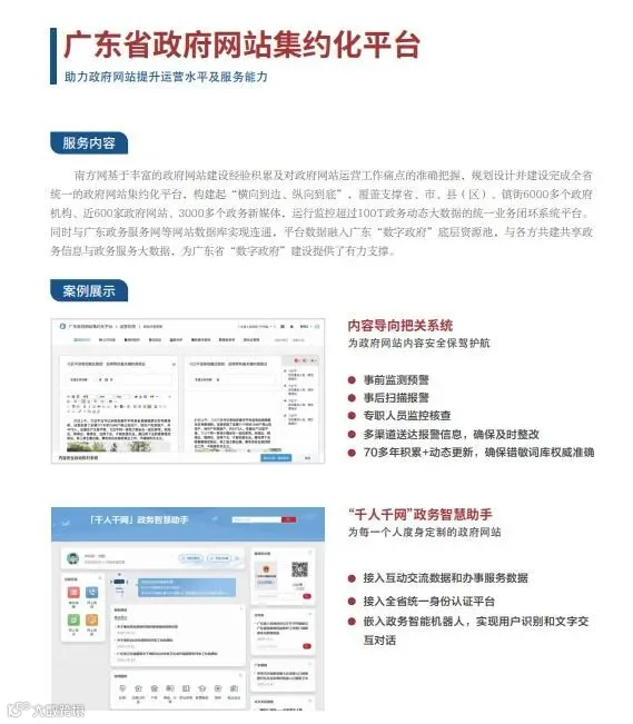 南方报业旗下的南方网基于丰富的政府网站建设经验积累及对政府网站运营工作痛点的准确把握,规划设计并建设完成全省统一的政府网站集约化平台,构建起“横向到边、纵向到底”,覆盖支撑省、市、县(区)、镇街6000多个政府机构、近600家政府网站、3000多个政务新媒体,运行监控超过100T政务动态大数据的统一业务闭环系统平台;同时与广东政务服务网等网站数据库实现连通,平台数据融入广东“数字政府”底层资源池,与各方共建共享政务信息与政务服务大数据,为广东省“数字政府”建设提供了有力支撑。