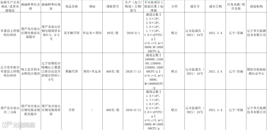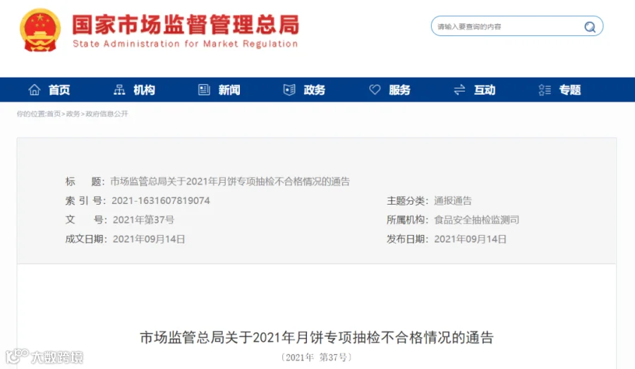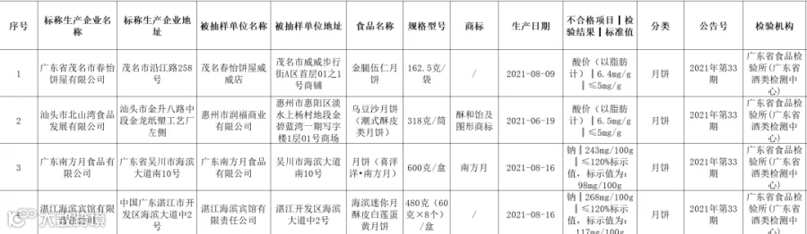 近日,广东省市场监督管理局在官网发布《广东省市场监督管理局关于中秋节食品专项抽检情况的通告(2021年第33期)》。