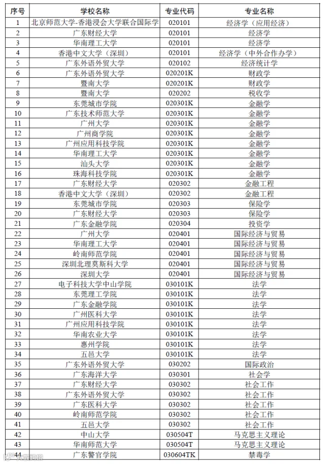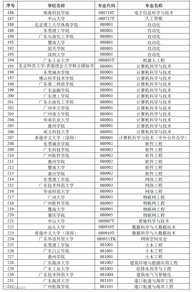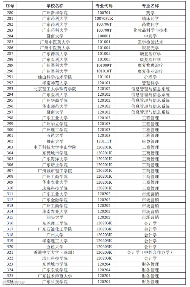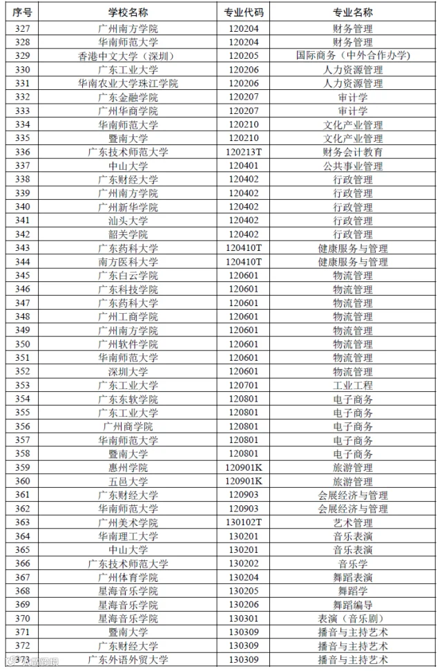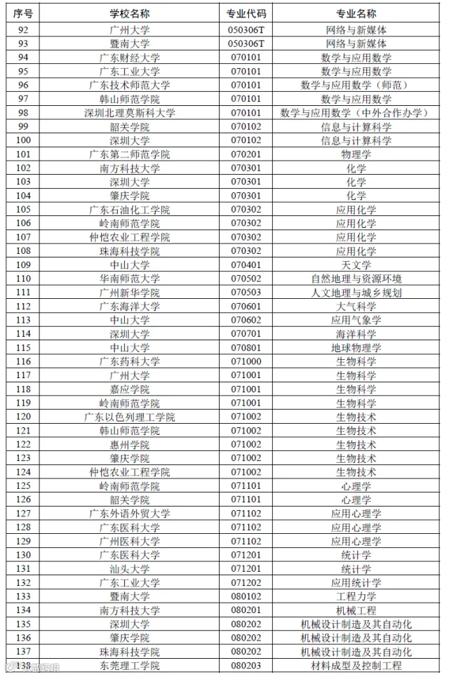 据统计,中山大学、华南理工大学、暨南大学、华南农业大学、华南师范大学、深圳大学、汕头大学、广东工业大学、广东外语外贸大学、广东财经大学、东莞理工学院等高校,均有超过10个专业在公示名单中。初步统计,至少有10所以上高校,均有10个以上专业在公示名单之中。