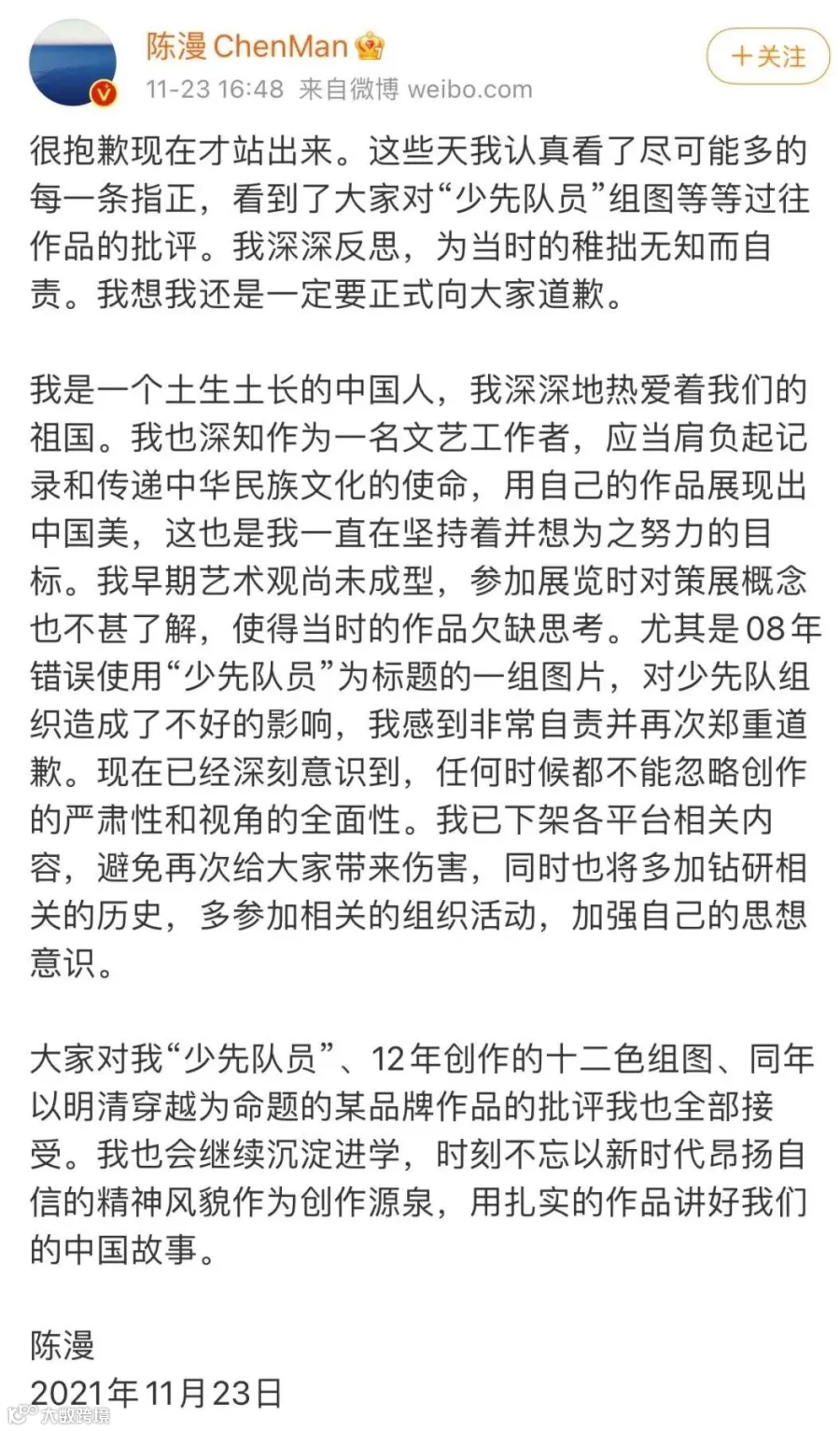 陈漫表示,已下架各平台相关内容,避免再次给大家带来伤害,同时也将多加钻研相关的历史,多参加相关的组织