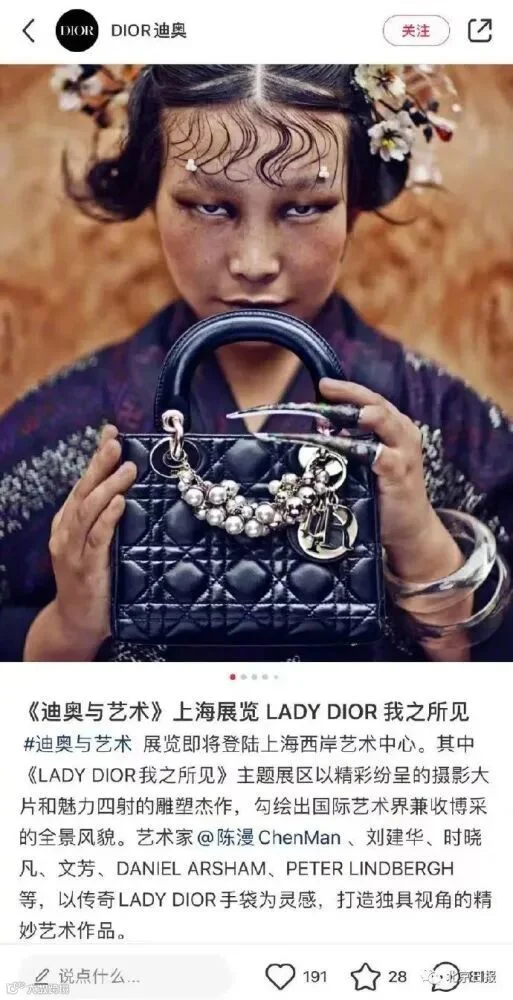 展出的《迪奥与艺术》因为一幅由摄影师陈漫拍摄的照片引发了网络热议。头发油腻、眉毛稀疏、眼神凶狠、浮肿单眼皮配上脏兮兮的眼妆,还戴着清朝护甲……照片中女模特的形象令人极其不适,网友怒批“太阴间”“丑化亚裔”。