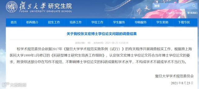 据复旦大学学术规范委员会消息,校学术规范委员会依据2017年《复旦大学学术规范实施条例(试行)》的有关程序开展调查核实工作,根据原上海医科大学1999年1月修订的《科研型博士研究生培养工作细则》,认定张文宏博士学位论文符合当年博士学位论文的要求,附录综述部分存在写作不规范,不影响博士学位论文的科研成果和学术水平,不构成学术不端或学术不当行为。