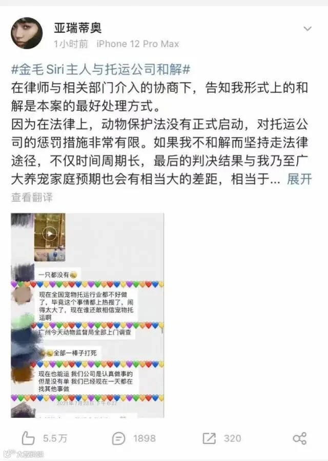 8月10日,金毛犬Siri主人陈女士在微博上表示,在相关部门的介入和律师的援助之下,其已和涉事托运公司达成和解。“形式上的和解是本案的最好处理方式。因法律上动物保护法并没有正式启动,对托运公司的惩罚措施非常有限……为不能让广大好心人士失望,也因律师建议,这是当下能争取到对涉事公司乃至行业最大的惩罚,所以做出这样的决定我也是无奈之举,希望大家能理解。在法律框架内是和解,在道德和情感上永远不会和解。”