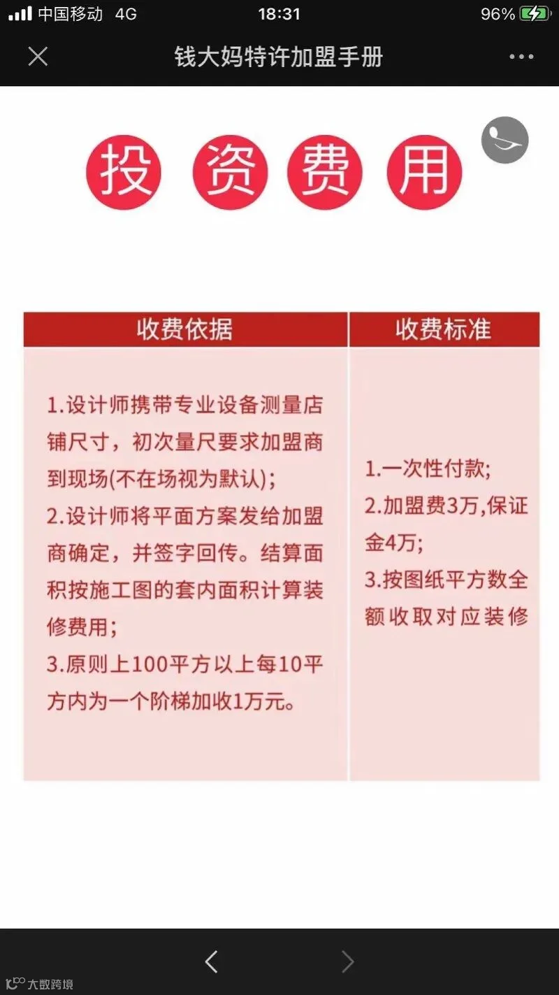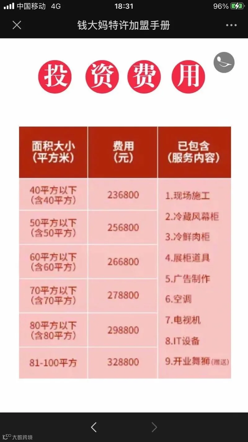 虽然,钱大妈生鲜的财务状况并未被外界知晓,但南都记者从该公司加盟招商手册也可见端倪。据了解,钱大妈生鲜生鲜门店启动费至少为236800元(40平方以下门店),最高为328800元(81至100平方门店),加盟保证金为4万元,加盟费3万元/年。