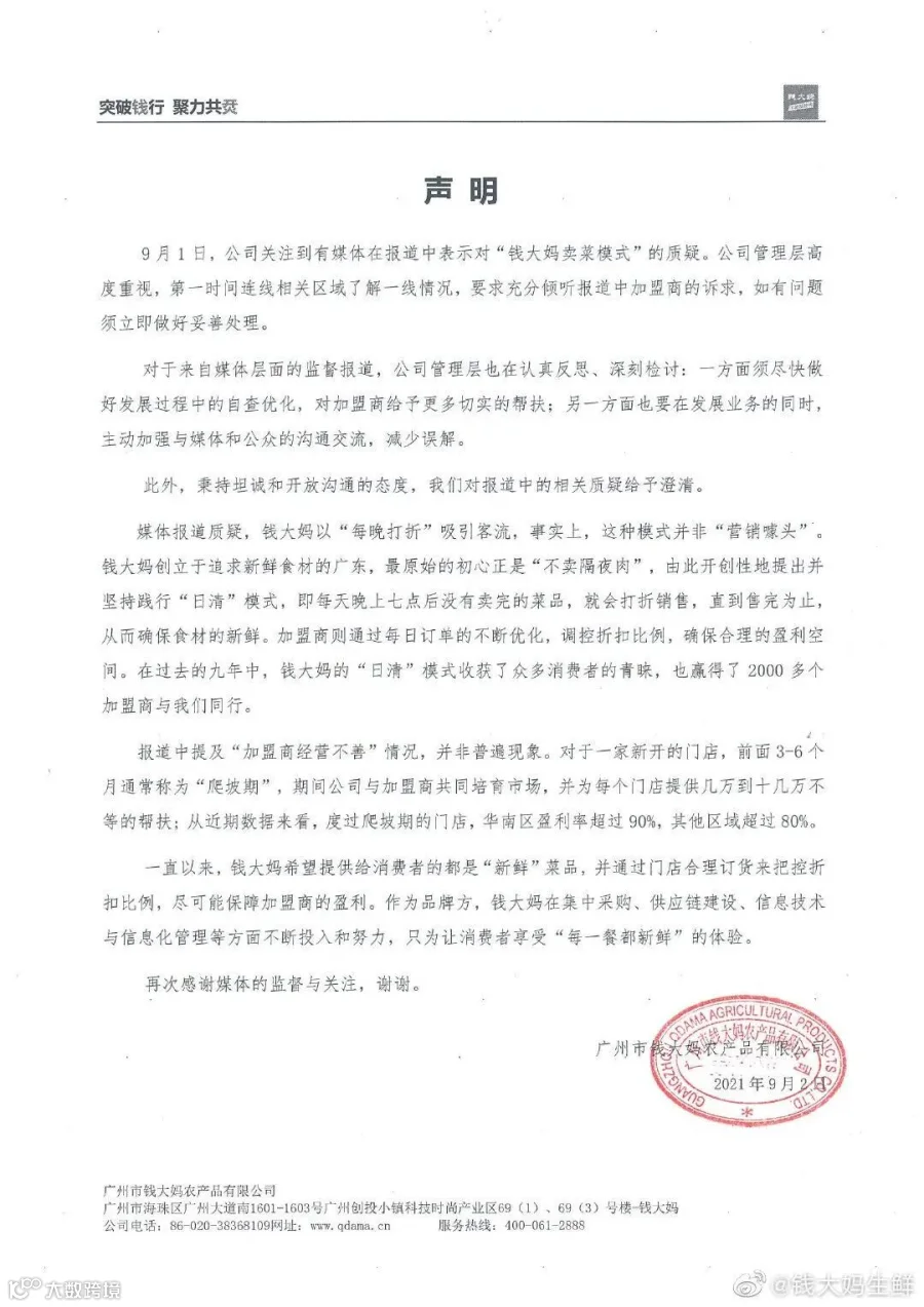 钱大妈生鲜针对相关报道的声明。据@钱大妈生鲜