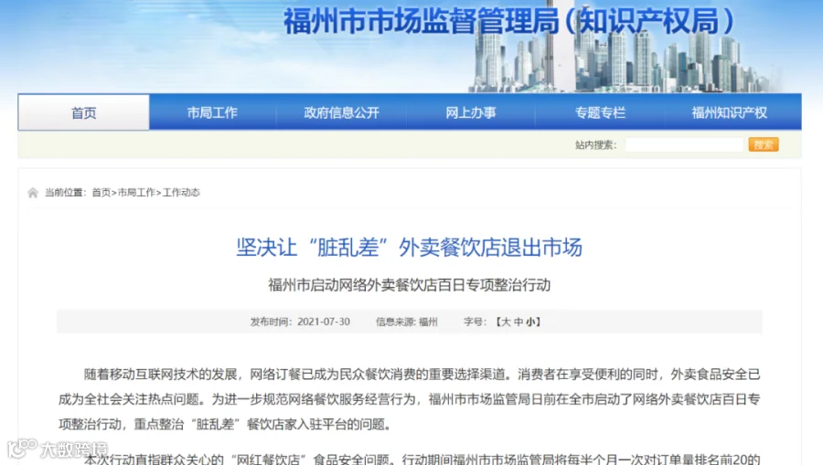 今年7月30日,福州市市场监督管理局发布公告称,为进一步规范网络餐饮