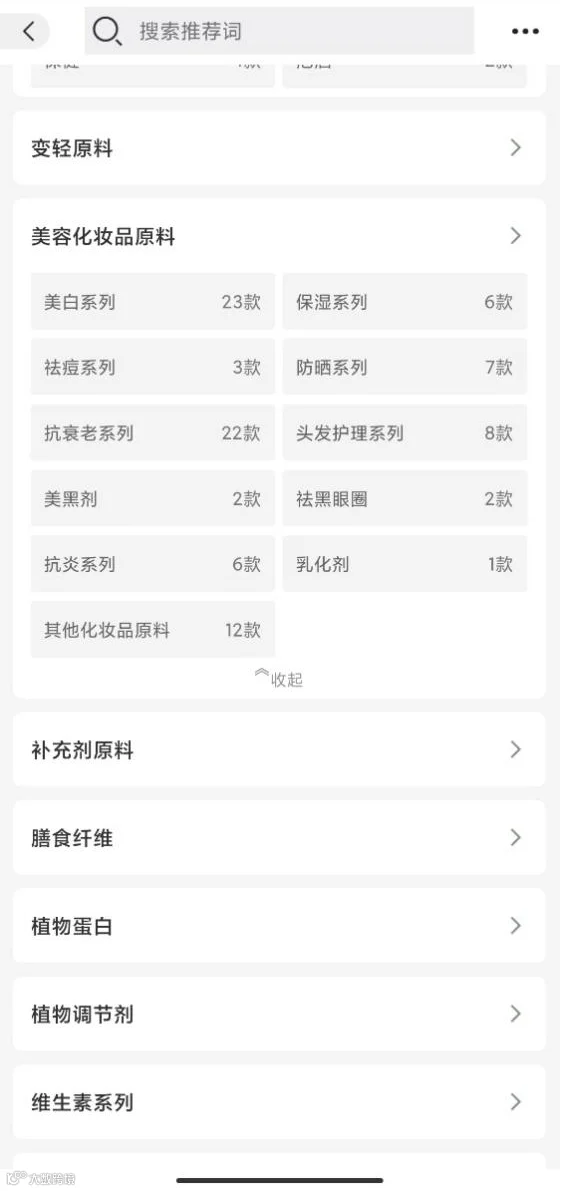 在阿里巴巴平台上一家名为“陕西泰克生物科技有限公司”的网店内,就有专门的美容化妆品原料这一分类,该大类下还有11个小类,包括美白、保湿、祛痘等。每个类别都有对应的原材料种类,跟客服沟通可以得知这些原料可以用于食品,都可以直接进行购买无需额外的登记手续。