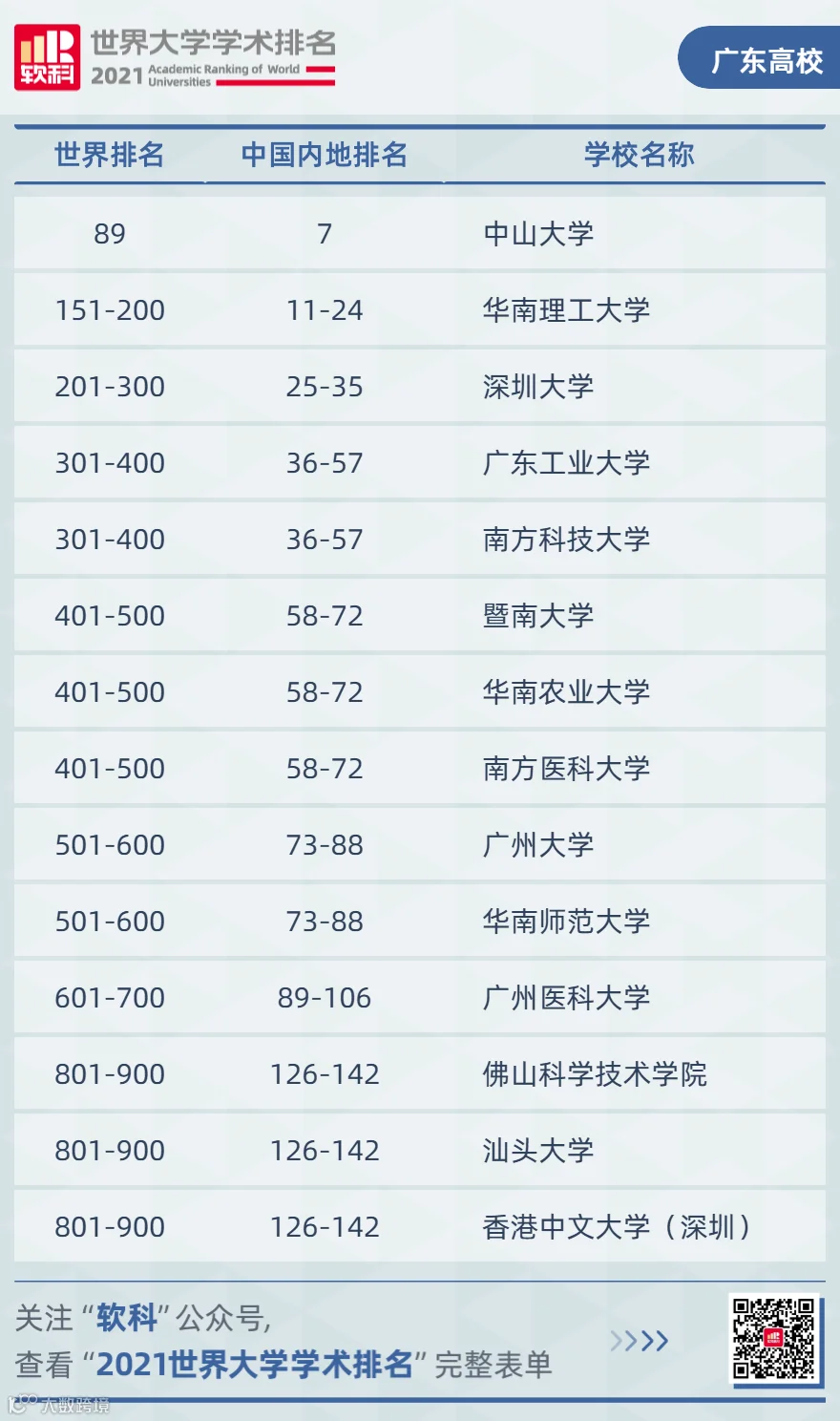 8月15日,高等教育评价机构软科正式发布“2021软科世界大学学术排名”(简称:ARWU 2021),排名展示了全球领先的1000所研究型大学,中国内地共有157所大学上榜。广东共有14所高校进入世界前1000,上榜高校总数全国第3,仅次于江苏21所、北京19所。中山大学成为广东首个入围全球百强的高校,位居第89位。