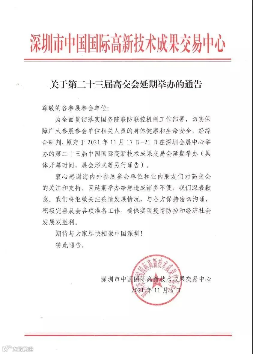 11月6日,记者从中国国际高新技术成果交易会(简称“高交会”)官网、微信公众号“高交会”获悉,原定于2021年11月17日至21日在深圳会展中心举办的第二十三届高交会延期举办,具体开幕时间、展会形式等另行通告。