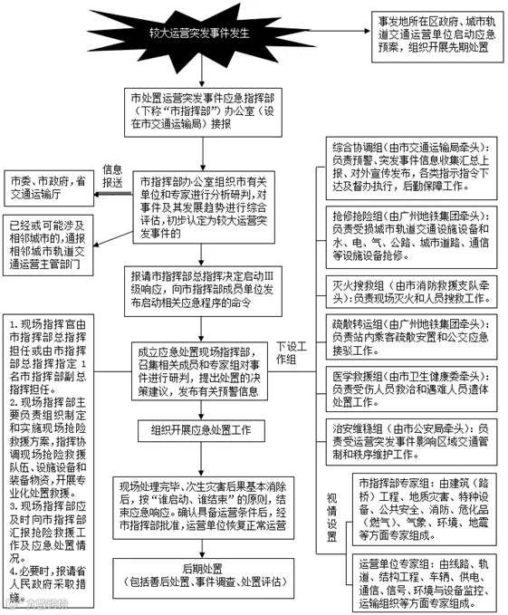 城市轨道所在地地级以上市人民政府及城市轨道交通运营单位(下称“运营单位”)负责运营突发事件先期处置,通过建立联动机制,确保应急处置工作规范有序。如果发生特别重大、重大运营突发事件,广东省人民政府根据需要成立省处置城市轨道交通运营突发事件应急指挥部,统一领导、指挥和协调运营突发事件应急处置工作。