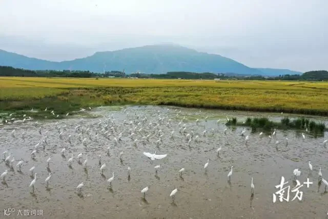 11月3日中午,清远市清城区黎塘村晚稻泛黄,一群白鹭正在田间湿地觅食。南方拍客 徐慧敏 供图