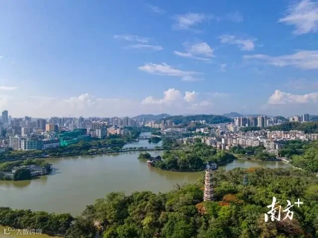 11月6日清晨,惠州西湖碧水蓝天,泗洲塔与市区融为一体。南方拍客 冯健文 供图