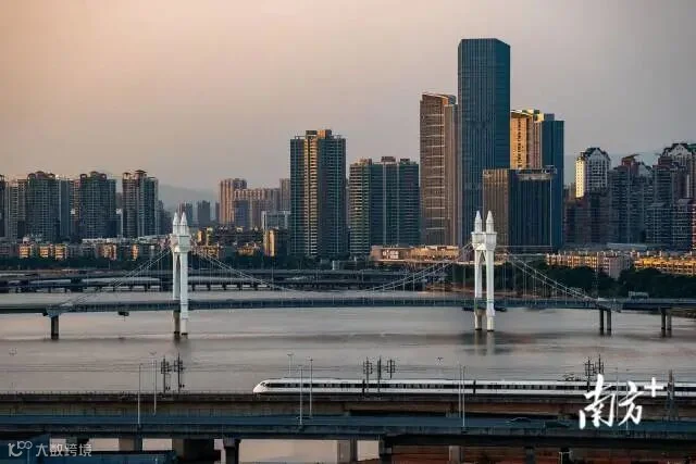 11月6日,黄昏时刻,开往珠海横琴的高铁驰骋在前山水道上。南方拍客 瑞 供图