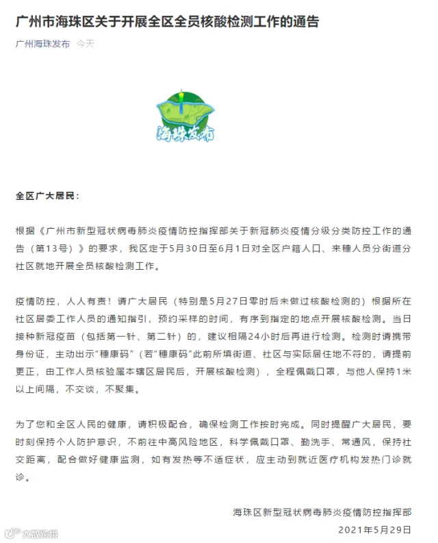 5月30日,广州海珠发布微信公众号发布通告,定于5月30日至6月1日对海珠区户籍人口、来穗人员分街道分社区就地开展全员核酸检测工作。以下是通告全文: