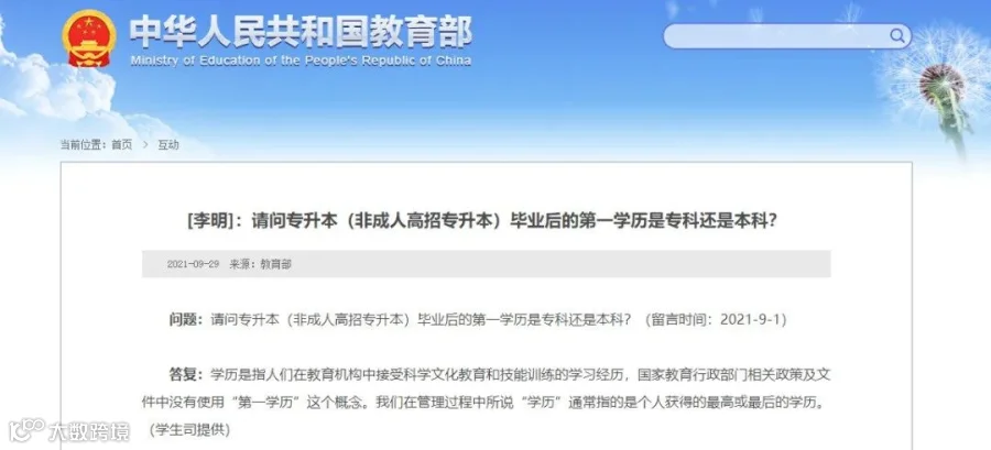 日前,教育部针对网友提问“请问专升本(非成人高招专升本)毕业后的第一学历是专科还是本科?”进行答复称: