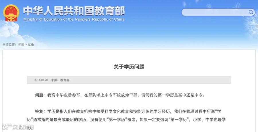 2014年8月,教育部在答复“我高中毕业后参军,在部队考上中专军校成为干部,请问我的第一学历是高中还是中专。”的提问中回复: