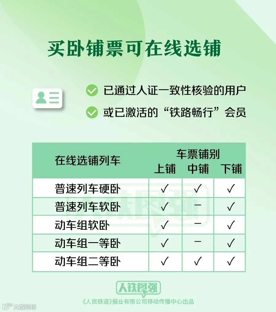 旅客在铁路12306网站和App上购买卧铺车票时,普速列车软卧、硬卧和动车组软卧、一等卧、二等卧等铺别可在线自主选铺。