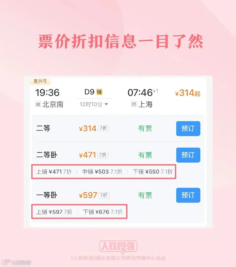 铁路12306App购票页面进行功能更新,新版购票页面可显示折扣信息,让旅客更加方便了解实时票价变化。