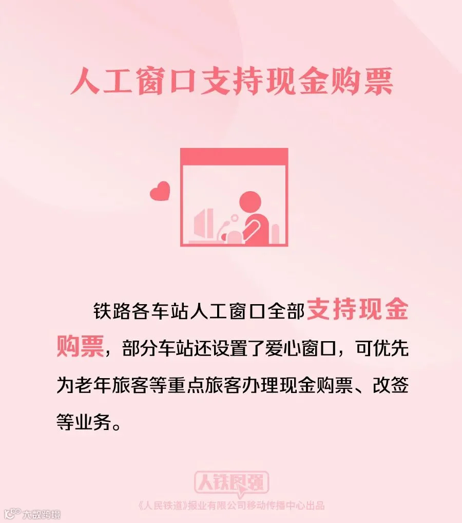 铁路各车站人工窗口全部支持现金购票,部分车站还设置了爱心窗口,可优先为老年旅客等重点旅客办理现金购票、改签等业务。