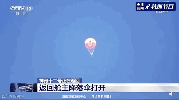 神十二航天员回家,离开黑障区后,引导伞、减速伞、主伞顺次打开,地面搜救分队实时接收落点预报!看↓