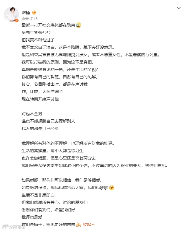 而谢楠此次发文,正是针对这些言论,为吴京正名。谢楠在长文中写道:“其实,节目刚播出时,都是在声讨我‘作’,计较,太关注细节,现在转而开始声讨他,对也不全对,谁也不能超脱自己去理解别人,代入的都是自己的经验。”这一回应展现出很高的生活智慧,也坦诚地向网友展现了他们夫妻的相处之道,而对于争议的声音,谢楠也表明了自己的态度,“我理解所有对他的不理解,也理解所有对我的批评。生活的实操里,每个人都是练习生,也许会做错题,但是心里还是奔着高分去。”