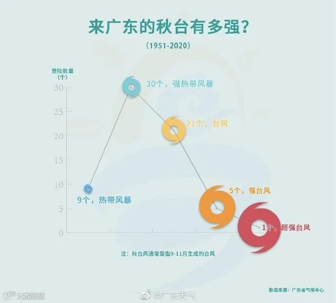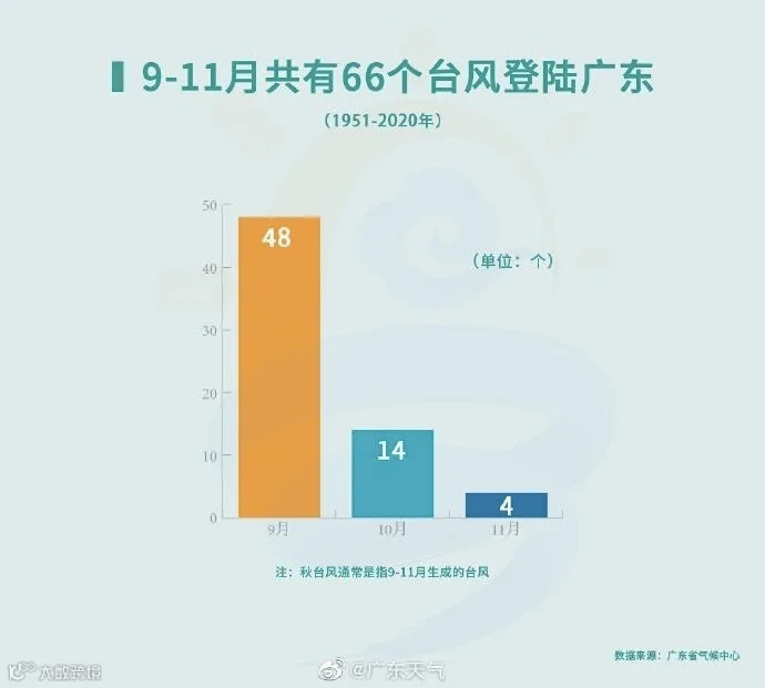 逐月来看,来广东的秋台风,最喜欢在9月登陆,过去70年共计48个,占到登陆广东秋台风总数的73%。