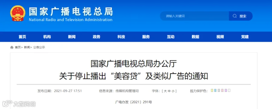 自即日起,各广播电视和网络视听机构、平台一律停止播出“美容贷”及类似广告。