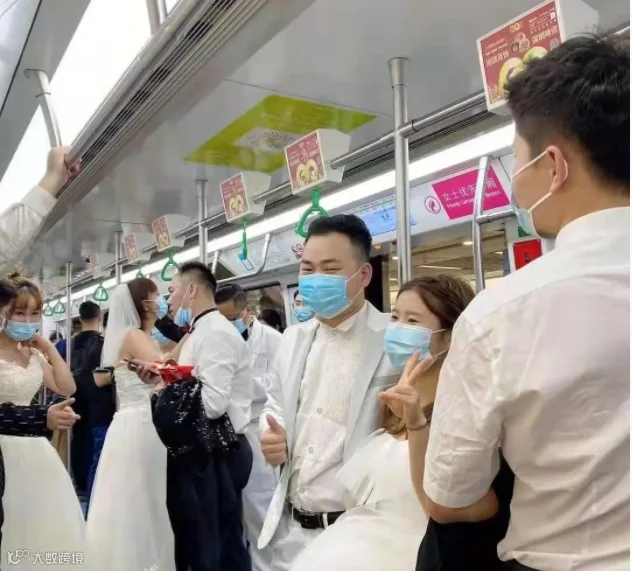 车厢内的新人加上伴郎、伴娘