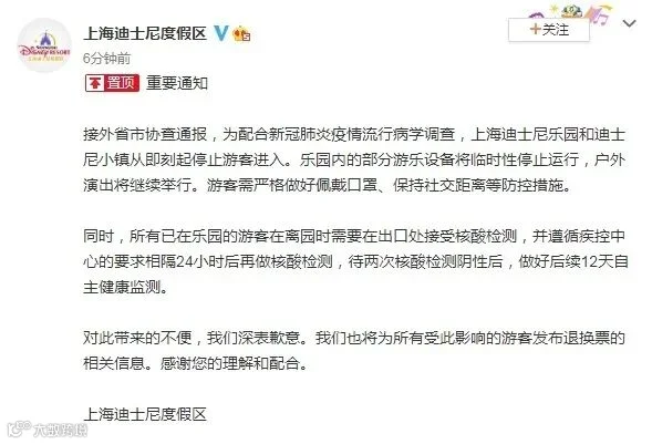 接外省市协查通报,为配合新冠肺炎疫情流行病学调查,上海迪士尼乐园和迪士尼小镇从即刻起停止游客进入。乐园内的部分游乐设备将临时性停止运行,户外演出将继续举行。游客需严格做好佩戴口罩、保持社交距离等防控措施。